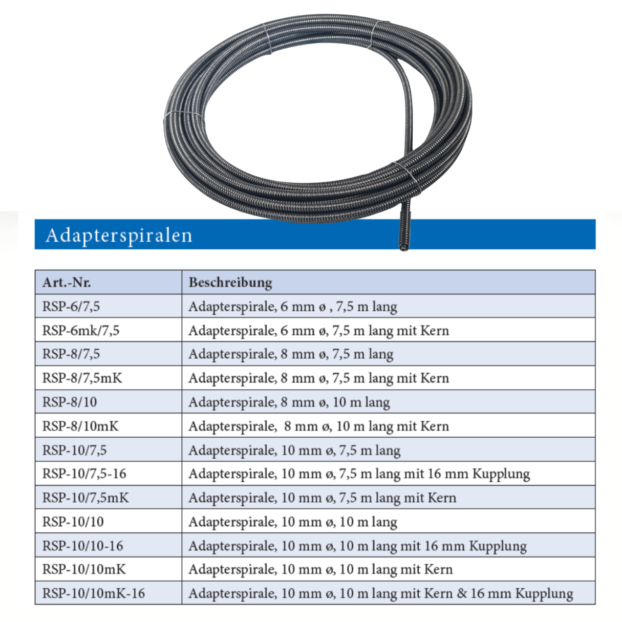 Adapter spiral, 10 mm x 7.5 m long without core, drain cleaning spiral