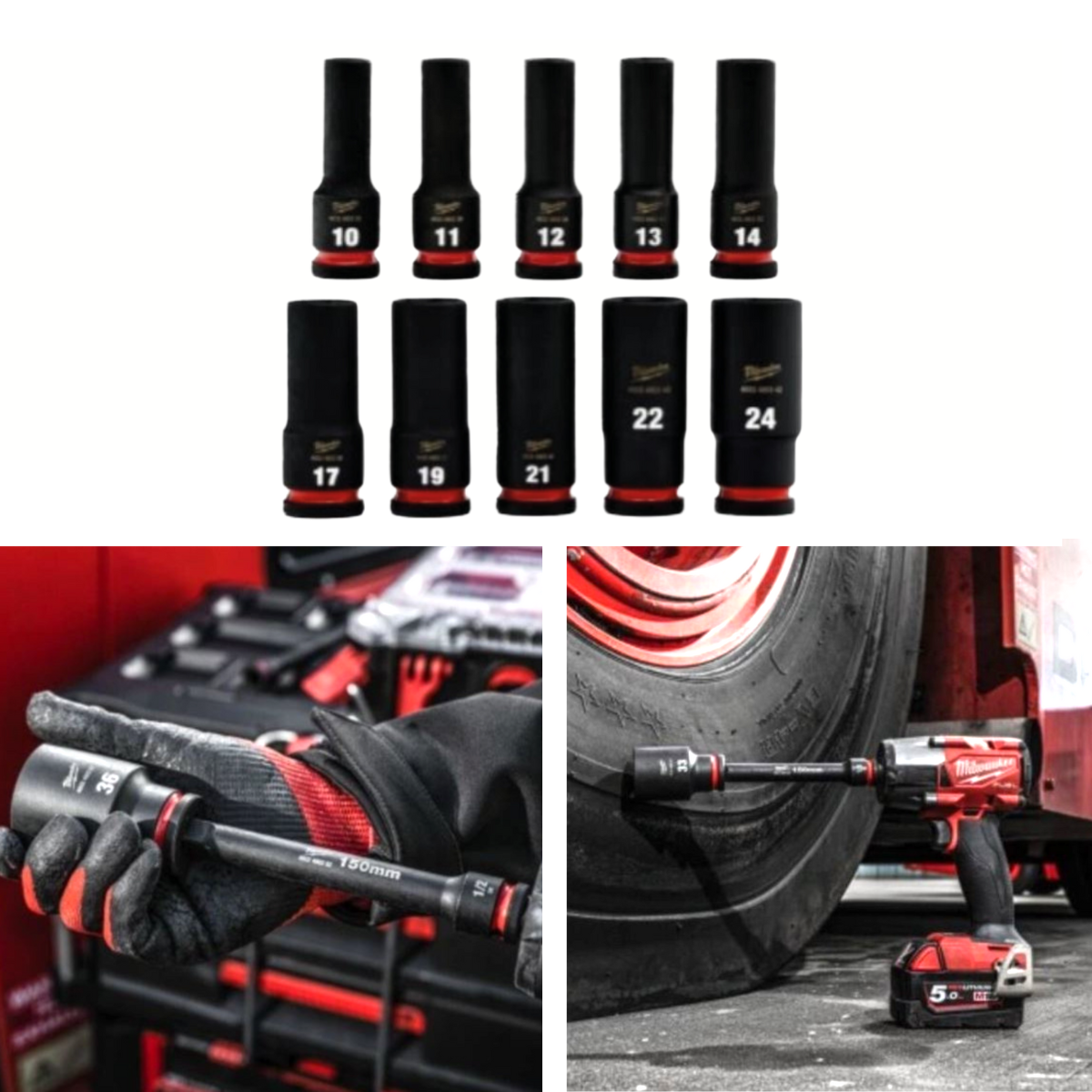 10 impact sockets: 10, 12, 13, 14, 15, 17, 19, 21, 22, 24 mm