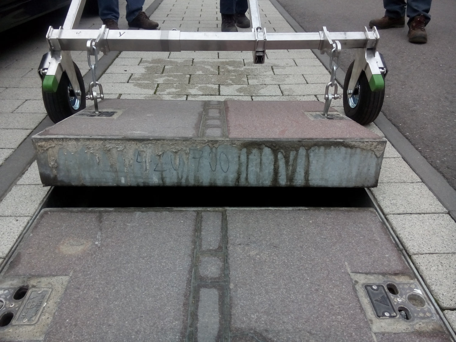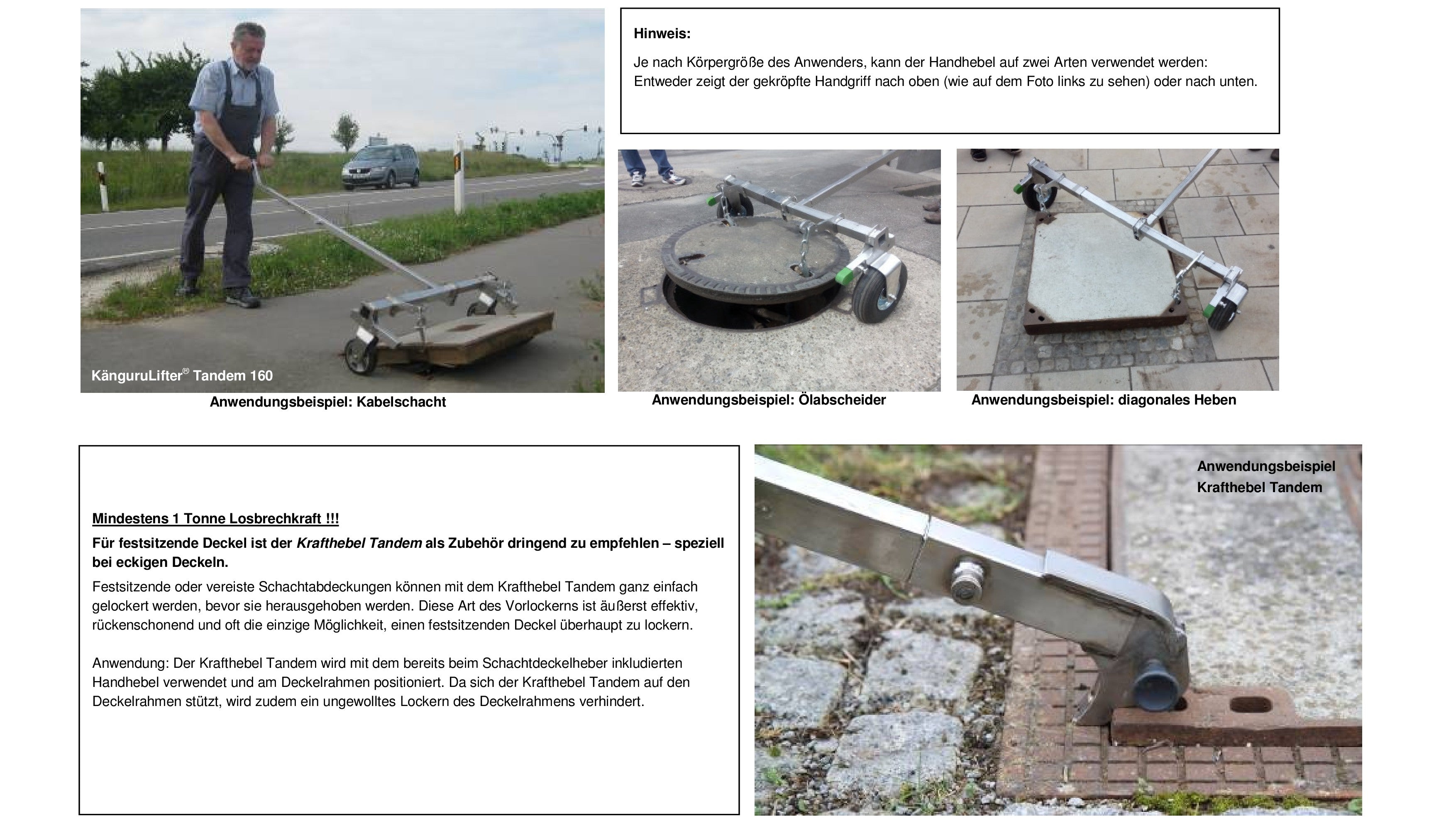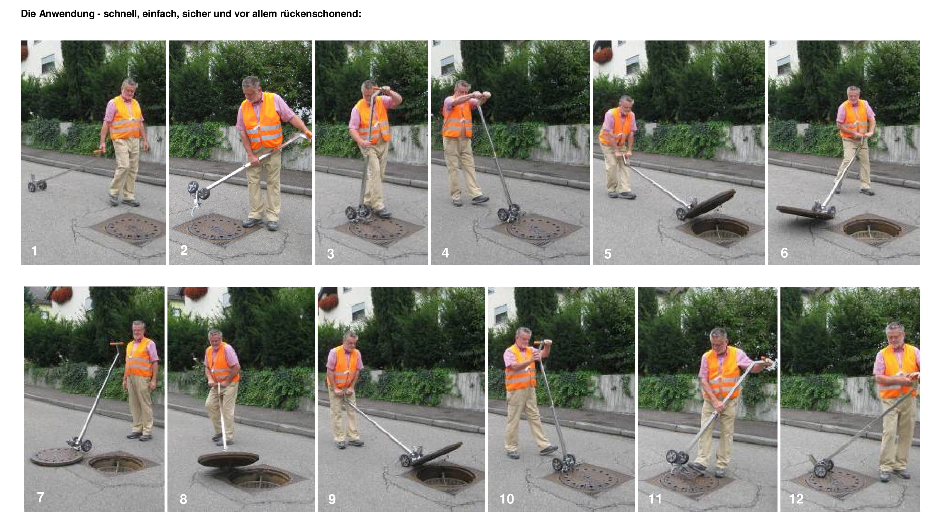 Der Schachtdeckelheber zum schnellen, sicheren und rückeschonenden Anheben, Wegfahren und Weidereinsetzten von Schachtabdeckungen aller Art