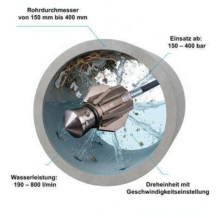 härtesten Verschmutzungen und Verstopfungen in Rohren mit einem Durchmesser von