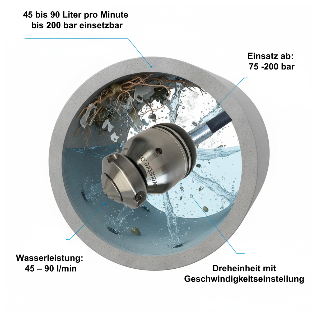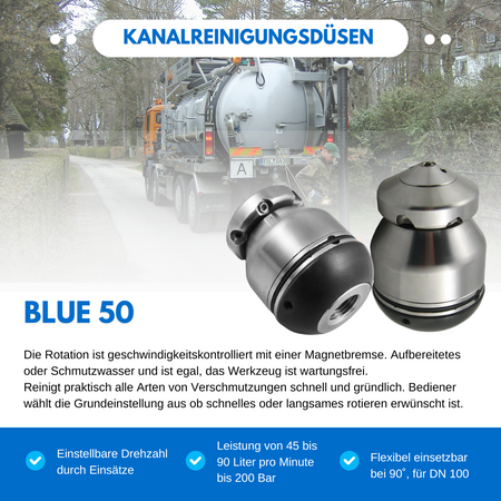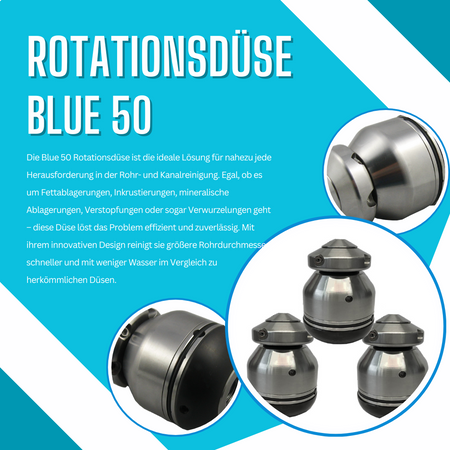 erwünscht ist. Die Reinigungsdüse Blue 50 reinigt größere Durchmesser