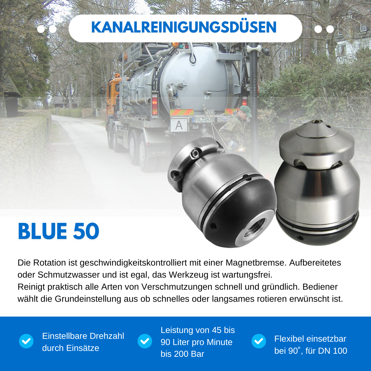 Mit unserer Rotierdüse Blue50 liefern wir Ihnen eine Düse, mit der Sie fast