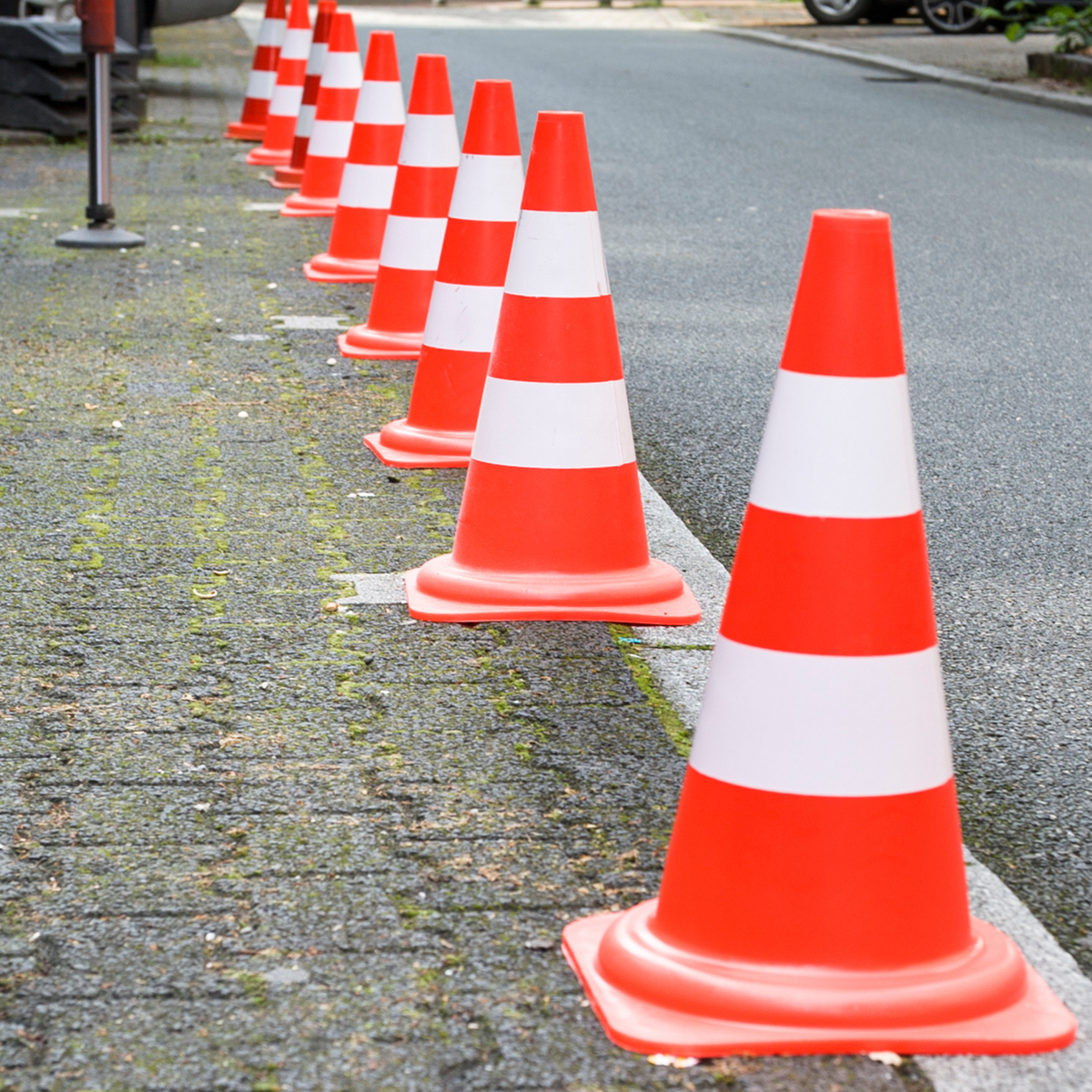 Gefahrenstellen. Der Warnkegel warnt mit seiner rot/weißen Farbgebung